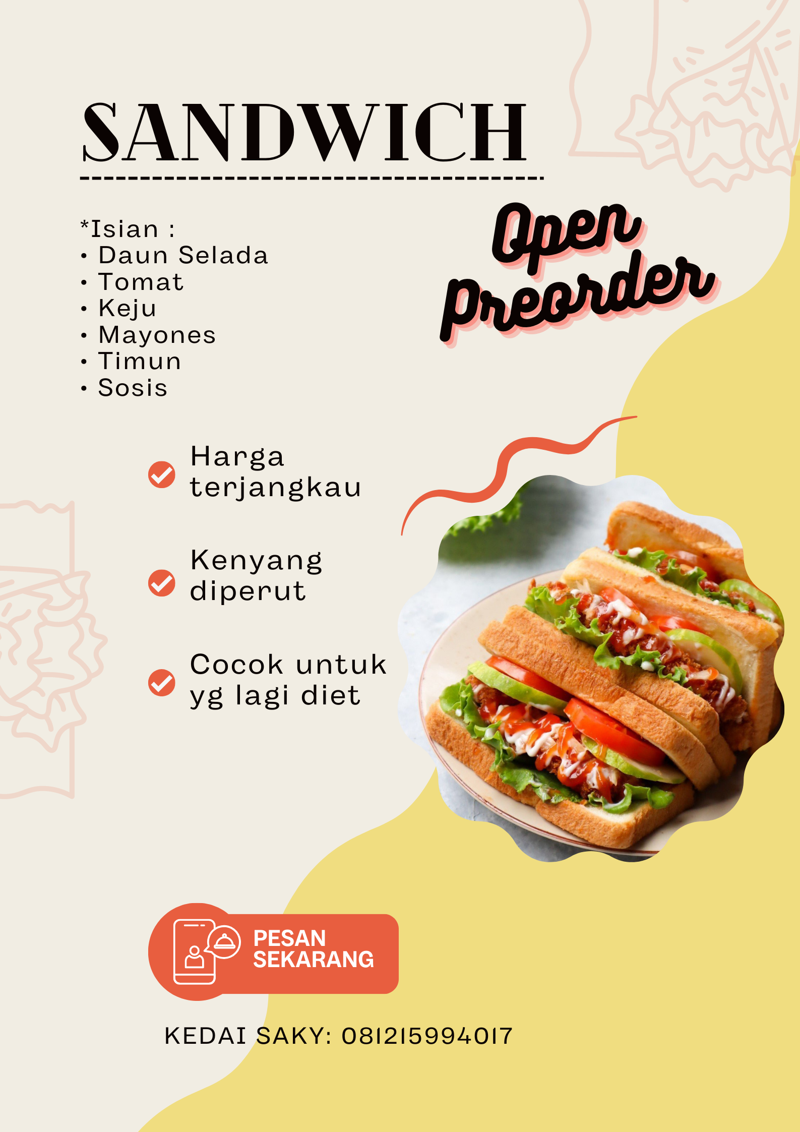 Sandwich merupakan sejenis hidangan yang juga dikenal sebagai roti isi. Makanan ini sangat mudah dibuat hanya dengan beberapa komponen yang mudah ditemukan seperti roti, keju, daging atau sosis, dan selada. Cocok buat kamu yang lagi program diet, yukk langsung cuss beli sandwich nya di Kedai Saky. Nikmati kelezatan nyaa…